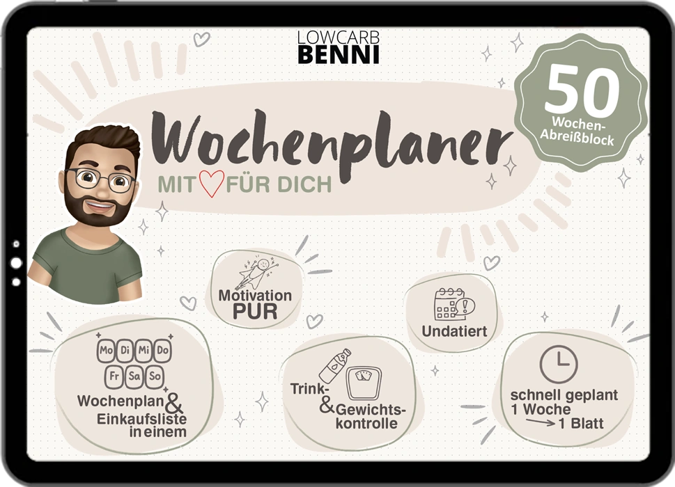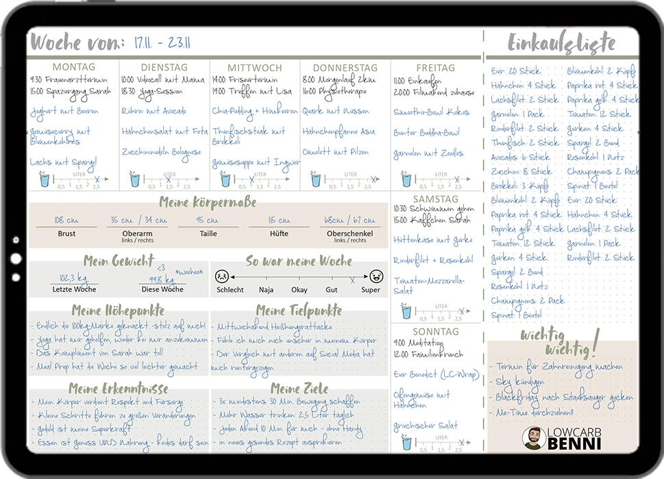 Ich habe diesen Wochenplaner mit ganz viel Liebe für dich entwickelt, damit er dein täglicher Anker wird. Er ist nicht einfach nur eine digitale Datei – er ist dein persönlicher Coach direkt auf deinem Tablet, Smartphone oder ausgedruckt! 📱🖨️ Mit diesem Plan behältst du endlich den Überblick über das, was wirklich zählt: Dein Wasserhaushalt, deine Erfolge und deine Maße. Nichts motiviert mehr, als schwarz auf weiß zu sehen, wie die Zentimeter an Taille und Hüfte schmelzen.